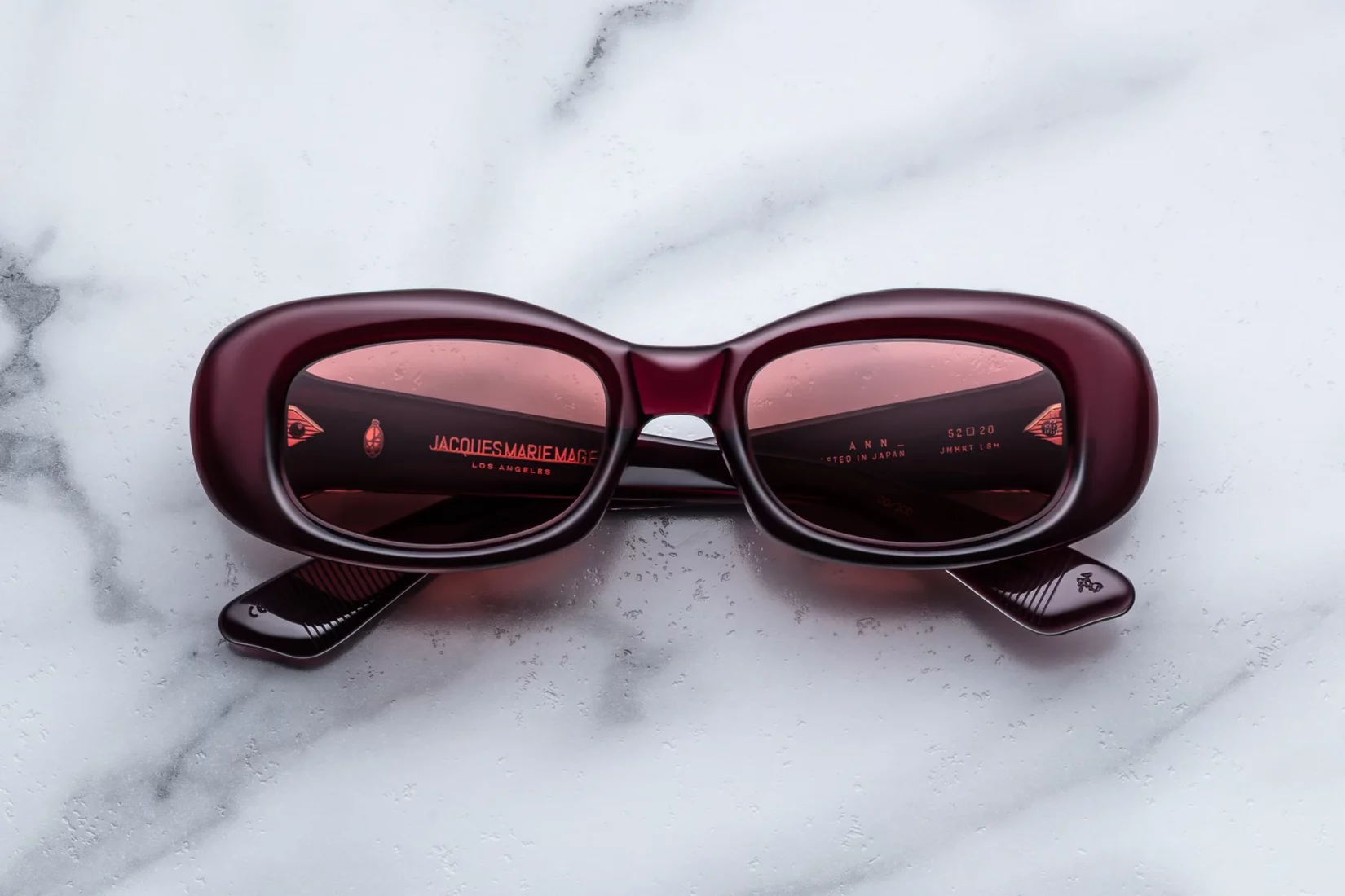 Ann in Amarena is a limited-edition rectangular frame inspired by late ’90s minimalism. Sculpted volumes and a softened silhouette create a confident yet understated look. Crafted from 10mm cured cellulose acetate, it features dark gold arrowhead pins, spur-shaped rivets, and exposed Cantilever wirecores. Finished with Armorlite Amarena lenses offering full UV protection. Limited to 200 pieces.