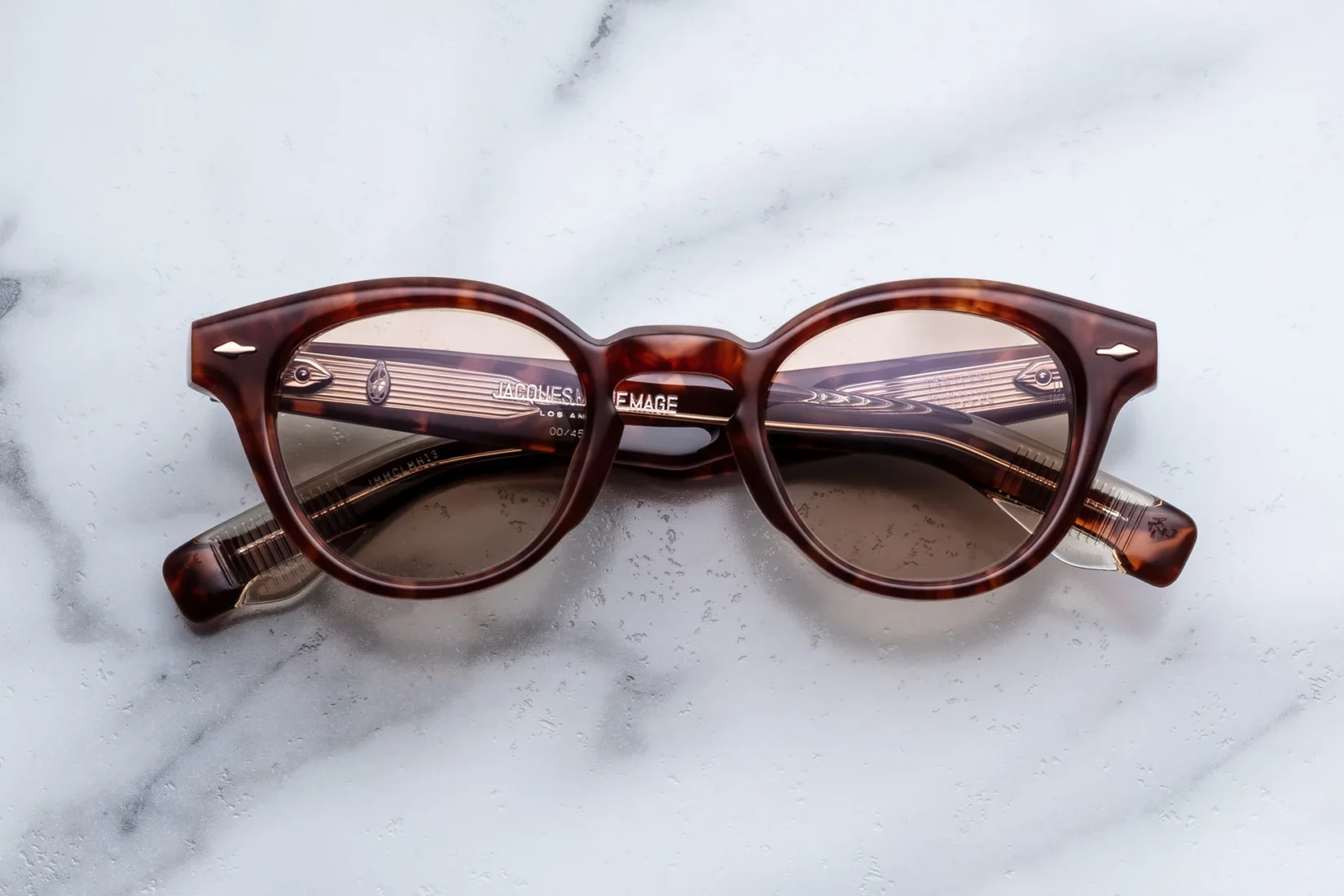 Handcrafted in Japan, the Clemens reflects Jacques Marie Mage’s commitment to meticulous artistry. The frame is fashioned from 10mm cured cellulose acetate with a polished havana front that transitions into custom double-laminated acetate temples — havana exteriors, centers, and clear beige interiors. Sterling silver signature arrowhead front pins anchor the design with poised elegance. Inside, hidden Classic wirecores plated in light gold reveal refined hairline engravings that speak to precision and performance. Custom 5-barrel hinges with light gold plating ensure smooth movement, while spur-shaped rivets lend sculptural strength. Together, these details create a frame that feels both structured and expressive.