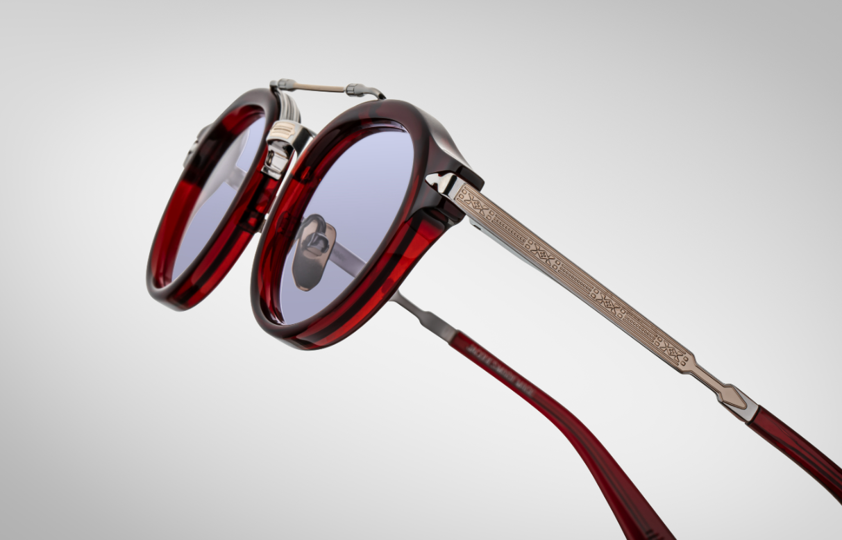 Bold and refined, the Jacques Marie Mage Delage in Cherry blends 1950s-inspired design with modern craftsmanship. Featuring a circular cherry acetate front, silver titanium brow bar, and custom arrowhead hinge, this limited-edition spectacle (300 pieces worldwide) delivers elegance with edge. Finished with Nimbus lavender lenses and intricate engravings, it’s a confident choice for collectors and creatives alike.