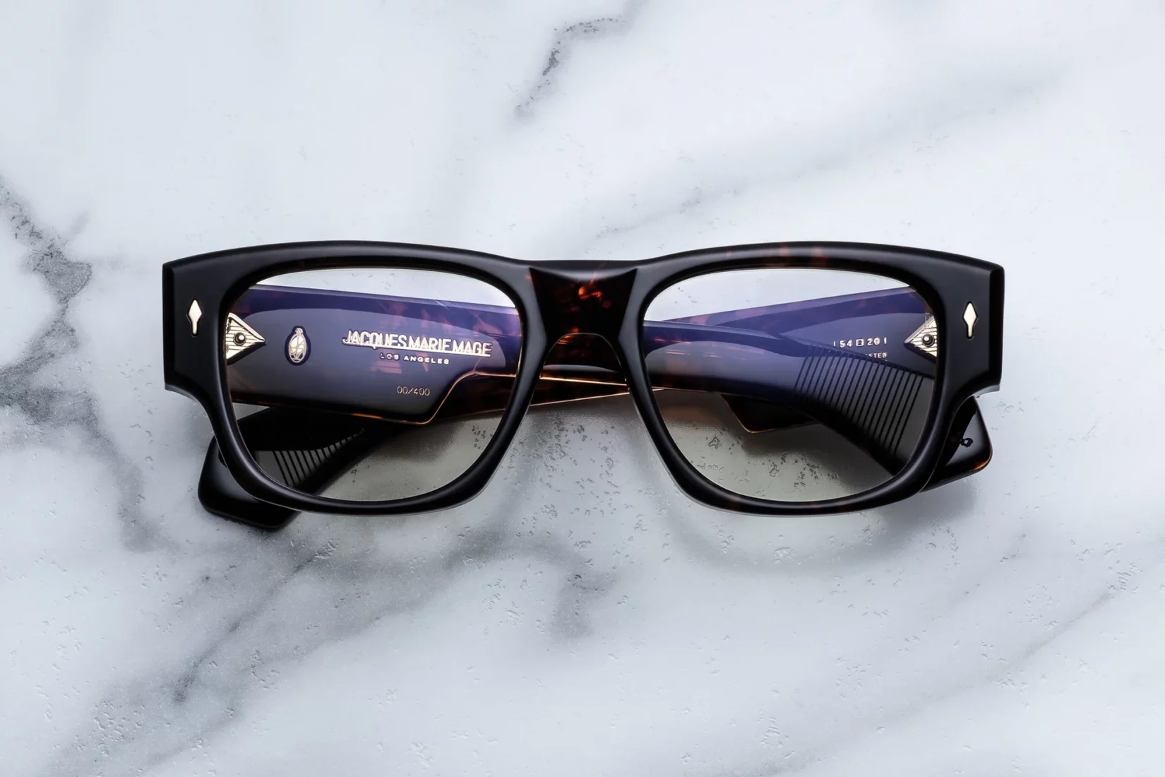 Handcrafted in Japan, the Dino features signature 10k dark gold arrowhead front pins, custom 9-barrel hinges, and exposed Barber wirecores plated in dark gold. Spur-shaped rivets and foil-stamped inner-temple hallmarks add refined sophistication. Each frame reflects meticulous attention to detail, combining expressive style with technical mastery. The sculptural brow and tiered temples demonstrate Jacques Marie Mage’s dedication to wearable art, where every element is purposeful and precise.