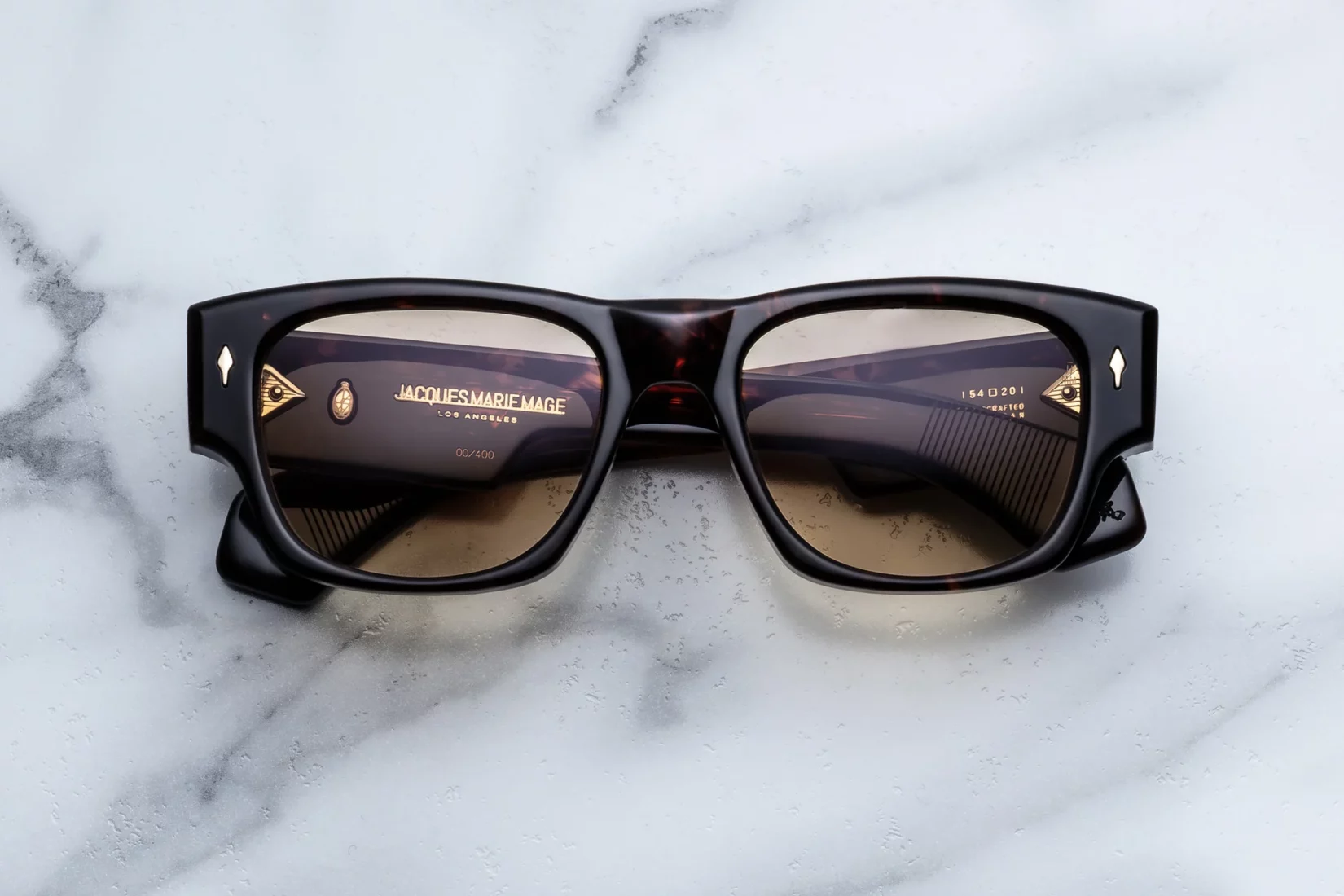 Handcrafted in Japan, the Dino features signature 10k dark gold arrowhead front pins, custom 9-barrel hinges, and exposed Barber wirecores plated in dark gold. Spur-shaped rivets and foil-stamped inner-temple hallmarks add refined sophistication. Each frame reflects meticulous attention to detail, combining expressive style with technical mastery. The sculptural brow and tiered temples demonstrate Jacques Marie Mage’s dedication to wearable art, where every element is purposeful and precise.