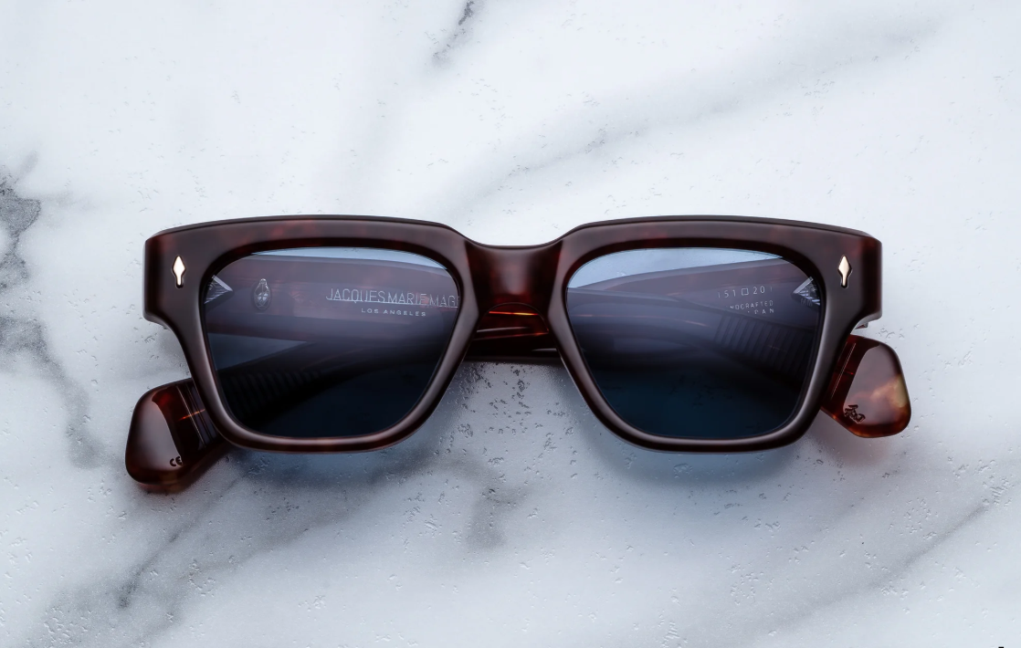 Jacques Marie Mage – Fellini in Breccia is a bold, medium-fit rectangular frame inspired by legendary filmmaker Federico Fellini. Handcrafted in a limited batch of 400 pieces, it features 10mm Breccia acetate, light gold arrowhead front pins, and sculptural double-laminated temples. The prussian blue CR39 lenses with anti-reflective treatment offer sharp vision and full UV protection. A perfect blend of vintage flair and modern craftsmanship.