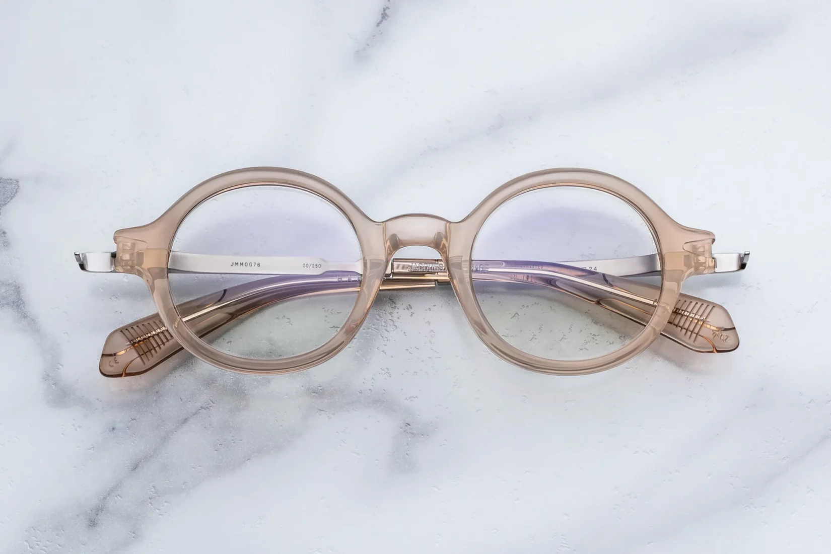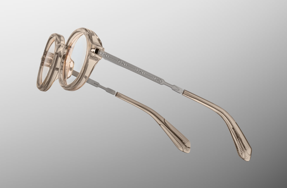 The temples, crafted in silver palladium titanium, bring a clean and luminous contrast. In addition, the hairline-engraved detailing highlights precision craftsmanship. Signature arrowhead monoblock hinges ensure strength and smooth movement.