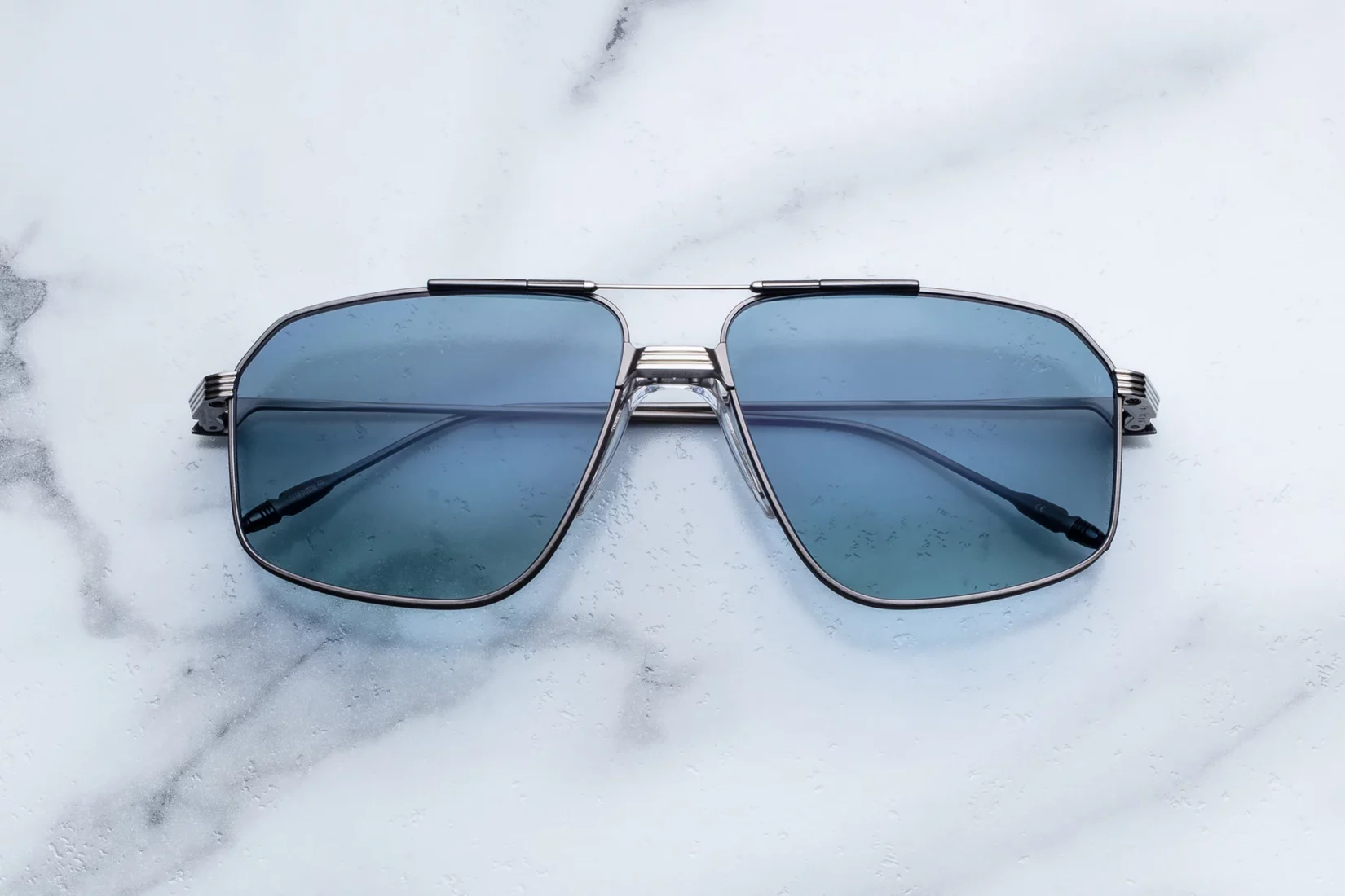 Handcrafted from 100% beta titanium, the Jagger features a gunmetal finish enhanced by refined silver accents. The sculptural bridge and brow bar create structure while maintaining lightness. In addition, custom monoblock hinges ensure durability and seamless movement. Temples are finished with hand-painted epoxy tailfin tips in silver and burgundy, adding a distinctive touch. Clear custom nose pads provide comfort and stability throughout the day. Armorlite 4-base lenses in Blue Gradient, with backside anti-reflective coating, deliver clarity, comfort, and full UV protection. Every detail is precise, functional, and expressive.