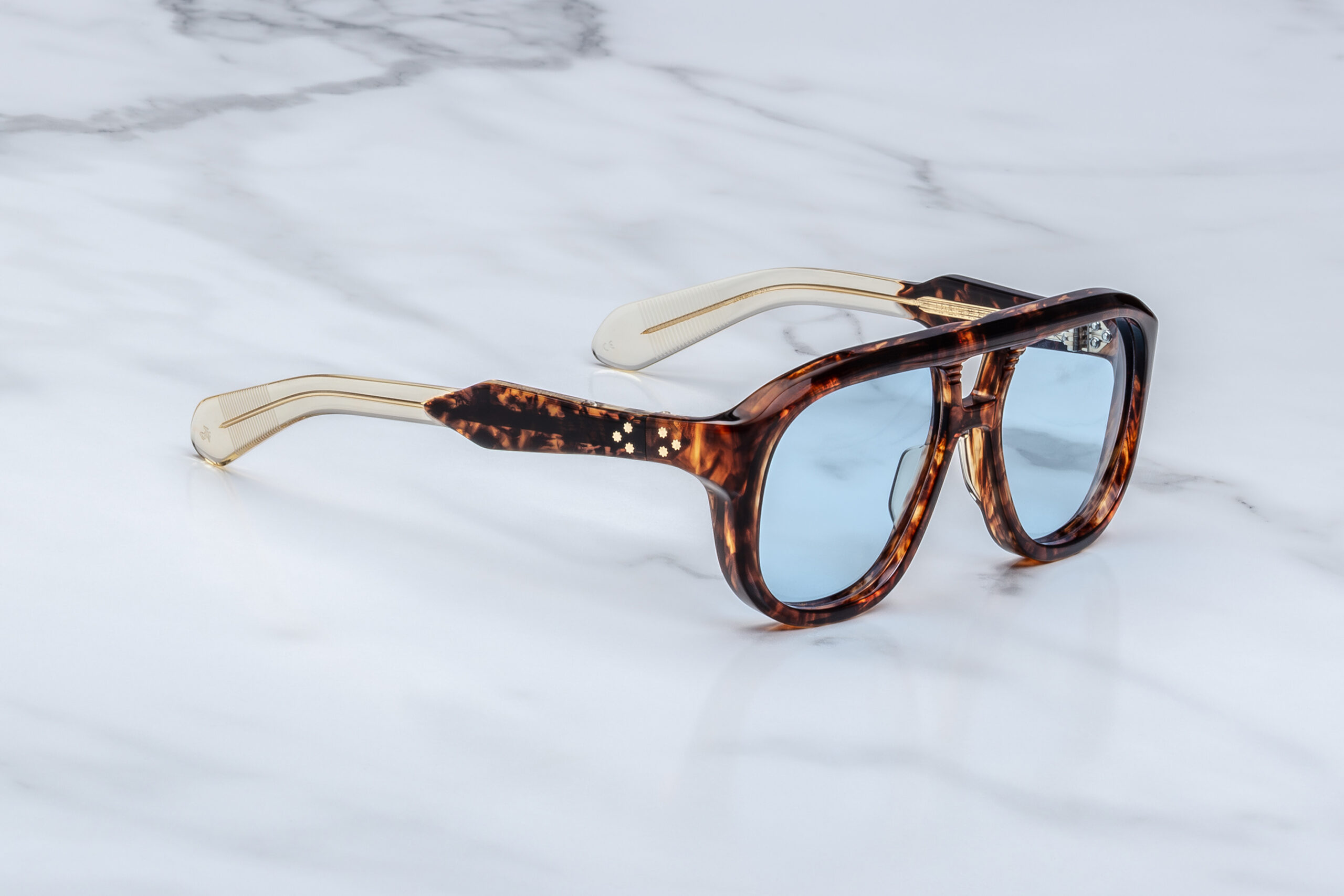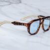 Expertly handcrafted in Japan, the Jasper in Argyle showcases JMM’s unmistakable precision and artistry. The 8mm cured cellulose acetate frame in warm Havana tones perfectly complements the luminous powder blue Armorlite CR39 lenses, treated with a backside anti-reflective coating for exceptional visual clarity. Dark gold-finished arrowhead front pins and exposed ‘Lever’ wirecores with refined Art Deco engravings add distinctive brilliance. The custom 7-barrel stainless steel hinges, plated in dark gold, ensure strength and a luxurious feel. Every detail reflects Jacques Marie Mage’s commitment to heritage craftsmanship and bold individuality.