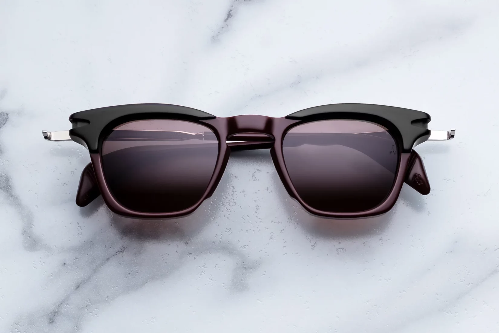 Handcrafted from 12mm cured cellulose acetate, the Kennedy features a polished burgundy frame with a black brow, making structured lines. Silver palladium titanium temples introduce contrast and refinement. In addition, finely engraved hairline details highlight the craftsmanship. Signature arrowhead monoblock hinges ensure durability and seamless movement. Sculptural acetate temple tips in Burgundy provide comfort and balance. Acetate nose pads enhance wearability for everyday use. Armorlite 4-base lenses in deep brown, with backside anti-reflective coating, deliver clarity, comfort, and full UV protection. Every detail is designed with precision and purpose.