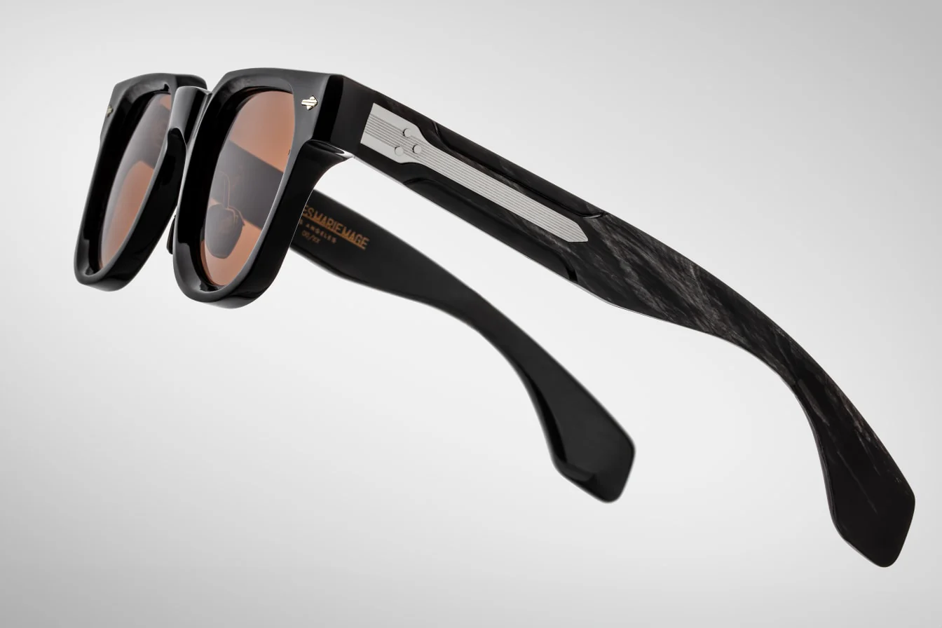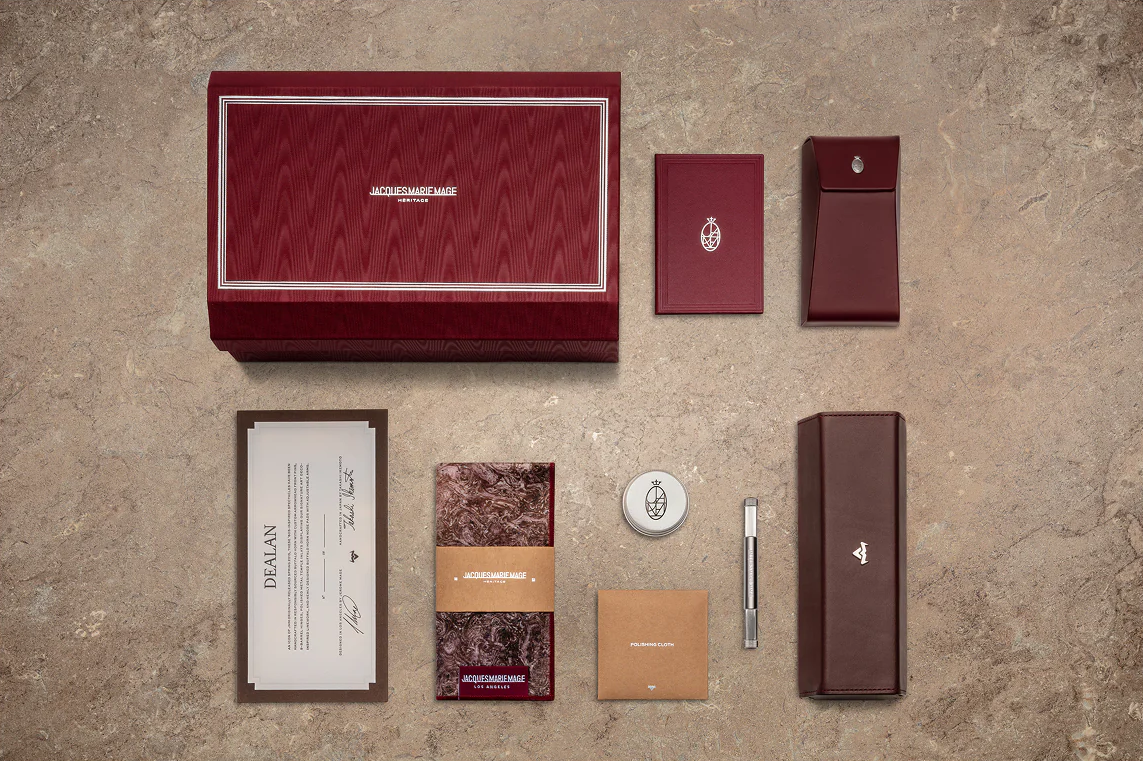 Every pair arrives in Jacques Marie Mage’s signature Bordeaux Empire collector’s box. Inside, you’ll find a custom leather case with buffalo emblem, a large microfiber cleaning cloth, a burgundy-enameled stainless steel screwdriver, and a tin of horn wax with polishing cloth.