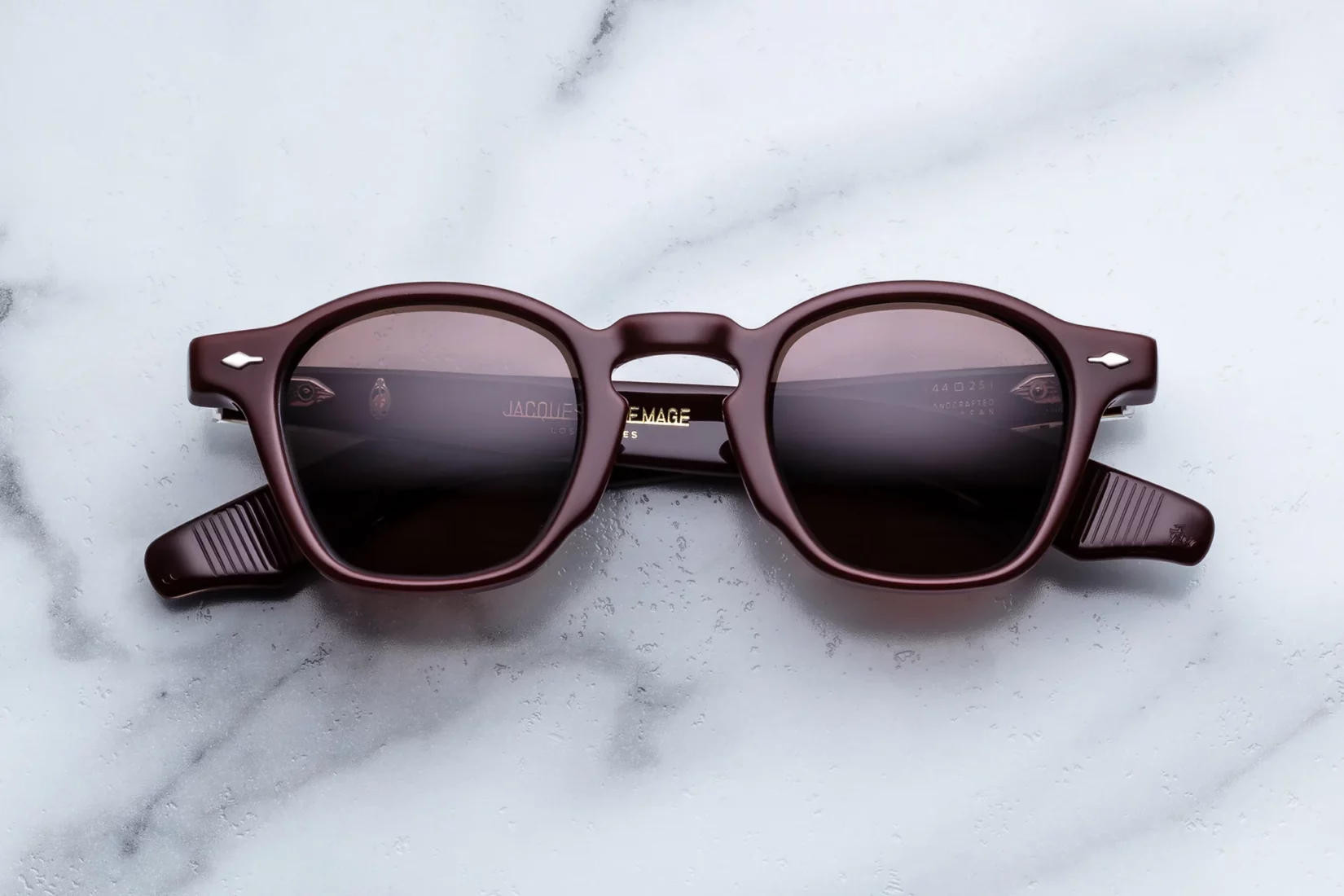 Zephirin in Bordeaux Empire is a timeless Jacques Marie Mage icon defined by slim lines and a refined silhouette. Handcrafted in Japan from cured cellulose acetate, it features sterling silver arrowhead pins, sculptural temples, and deep brown CR39 lenses with anti-reflective treatment. A limited-edition frame made for everyday elegance.