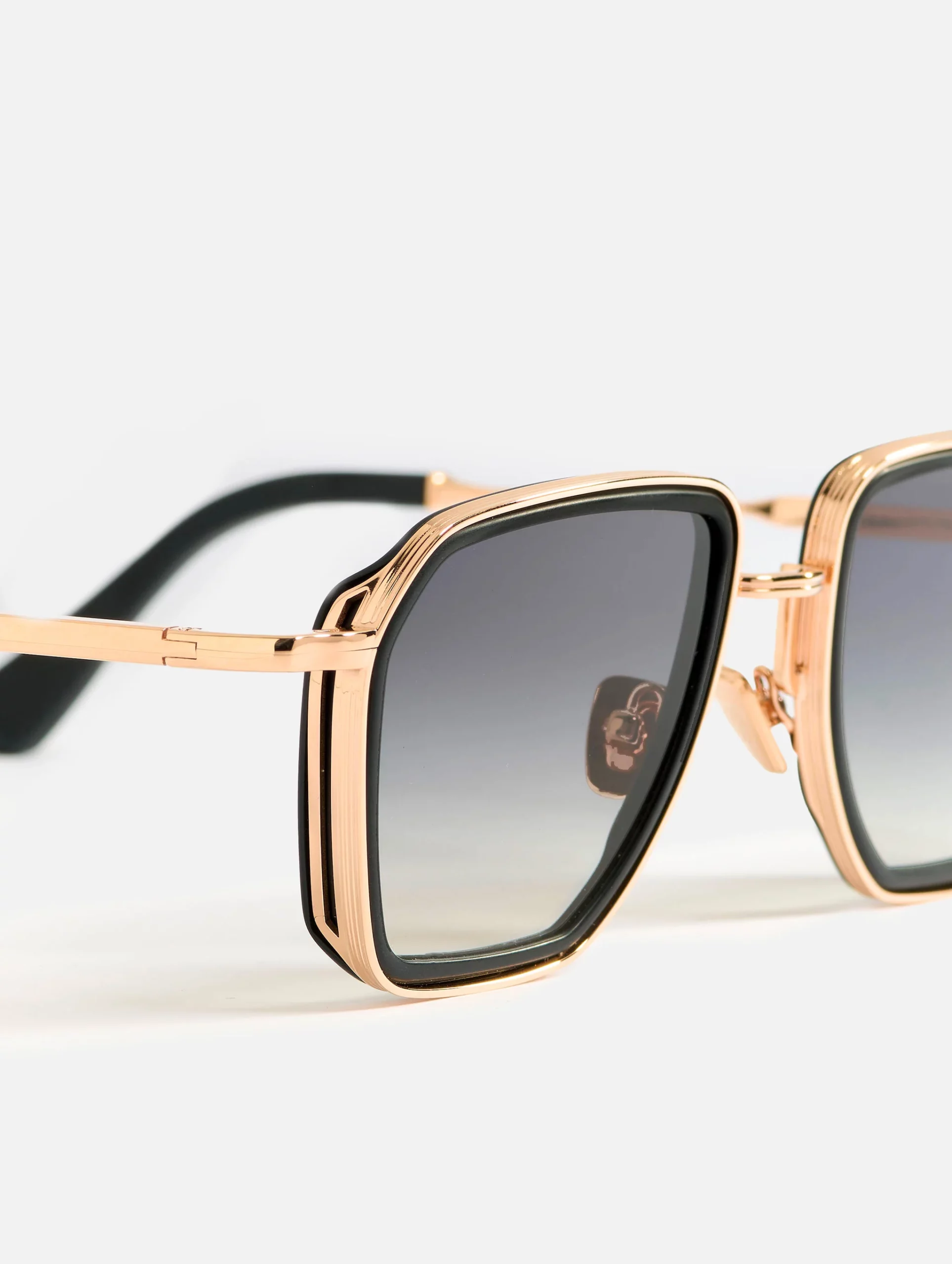 Discover Andre C114, a masculine oversized rectangular frame with rims carved from a 4mm engraved metal strip. Crafted from custom matte black acetate and 22-carat rose gold plated alloy, these frames epitomize luxury. Grey gradient CR39 lenses with AR treatment ensure superior clarity. Includes a premium case and cleaning cloth for ultimate protection.