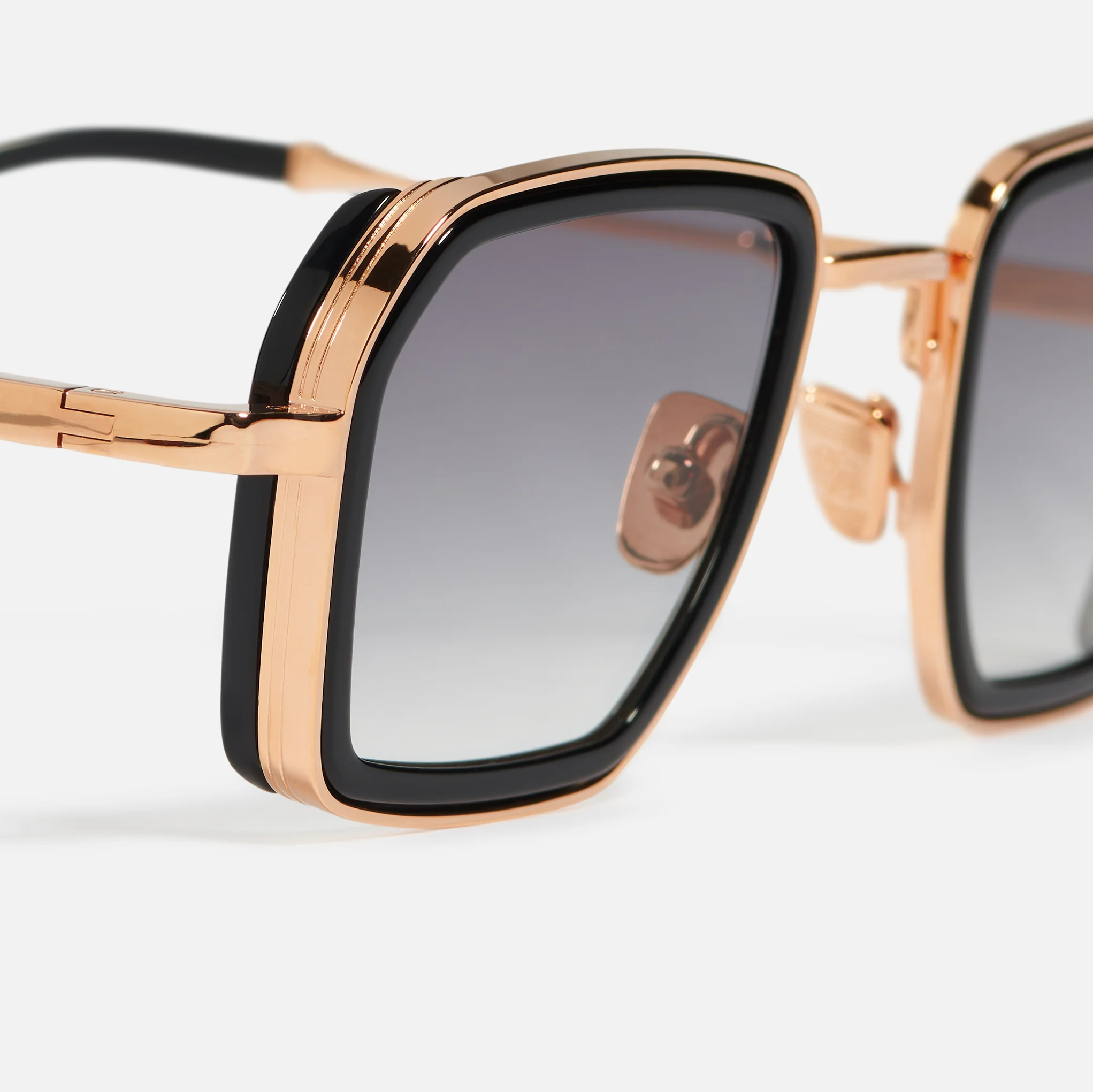 The Cillian C105 features a masculine rectangular shape with acetate rims that stand out, delicately cut from a 4mm streak-engraved metal strip. Its allure is further enhanced by signature temples adorned with John Dalia’s engraved end pieces, embodying artisanal craftsmanship at its finest. Crafted from custom infinite black acetate and a 22-carat rose gold-plated alloy frame with a 5µ layer and jewelry stamp inside the temple, these frames combine luxury with durability.
