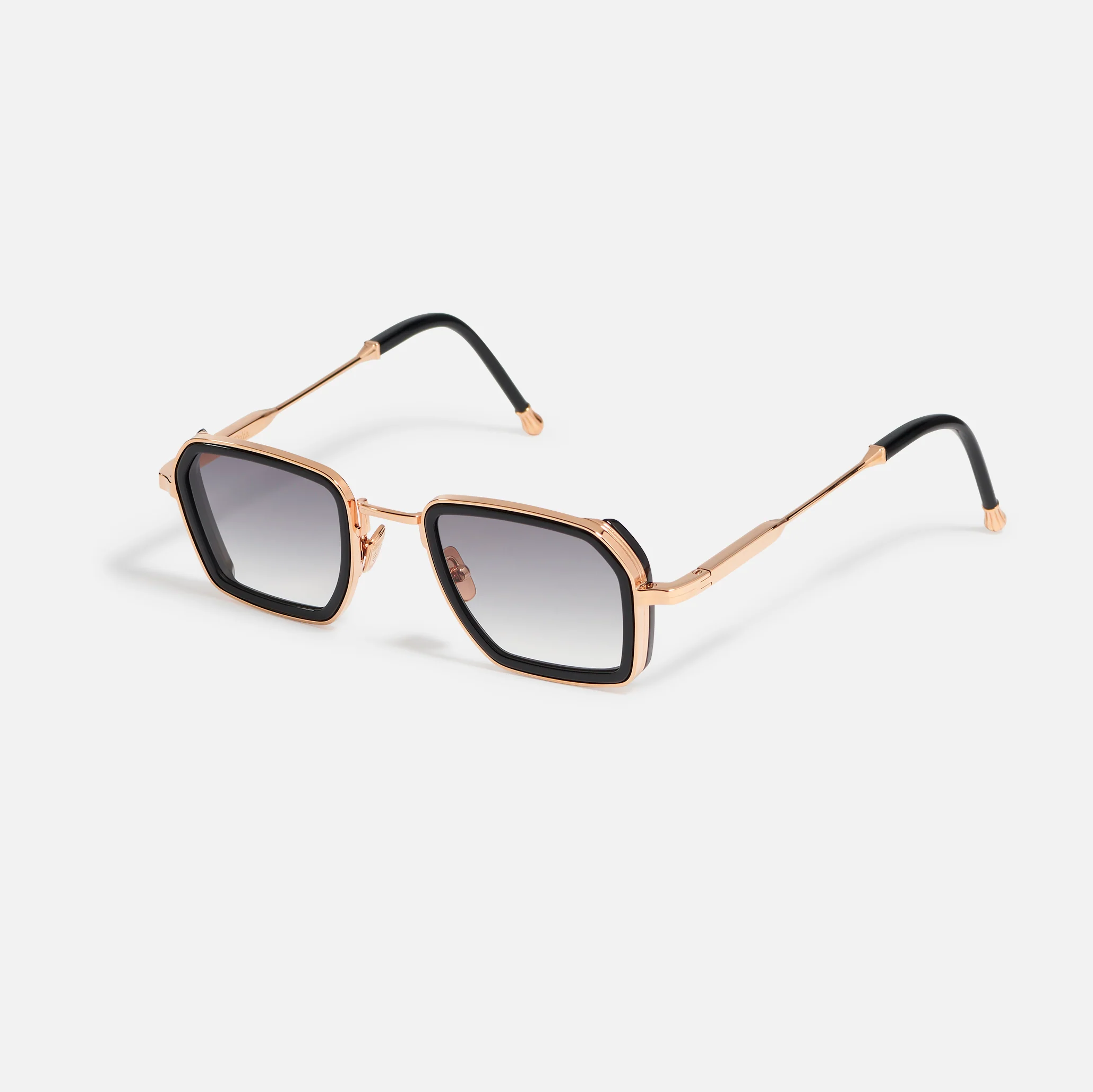 Discover Cillian C105, a masculine rectangular frame with acetate rims cut from a 4mm streak-engraved metal strip. Crafted from custom infinite black acetate and 22-carat rose gold-plated alloy, these frames epitomize luxury. Grey gradient CR39 lenses with AR treatment ensure superior clarity. Includes a bespoke case and cleaning cloth for ultimate protection.