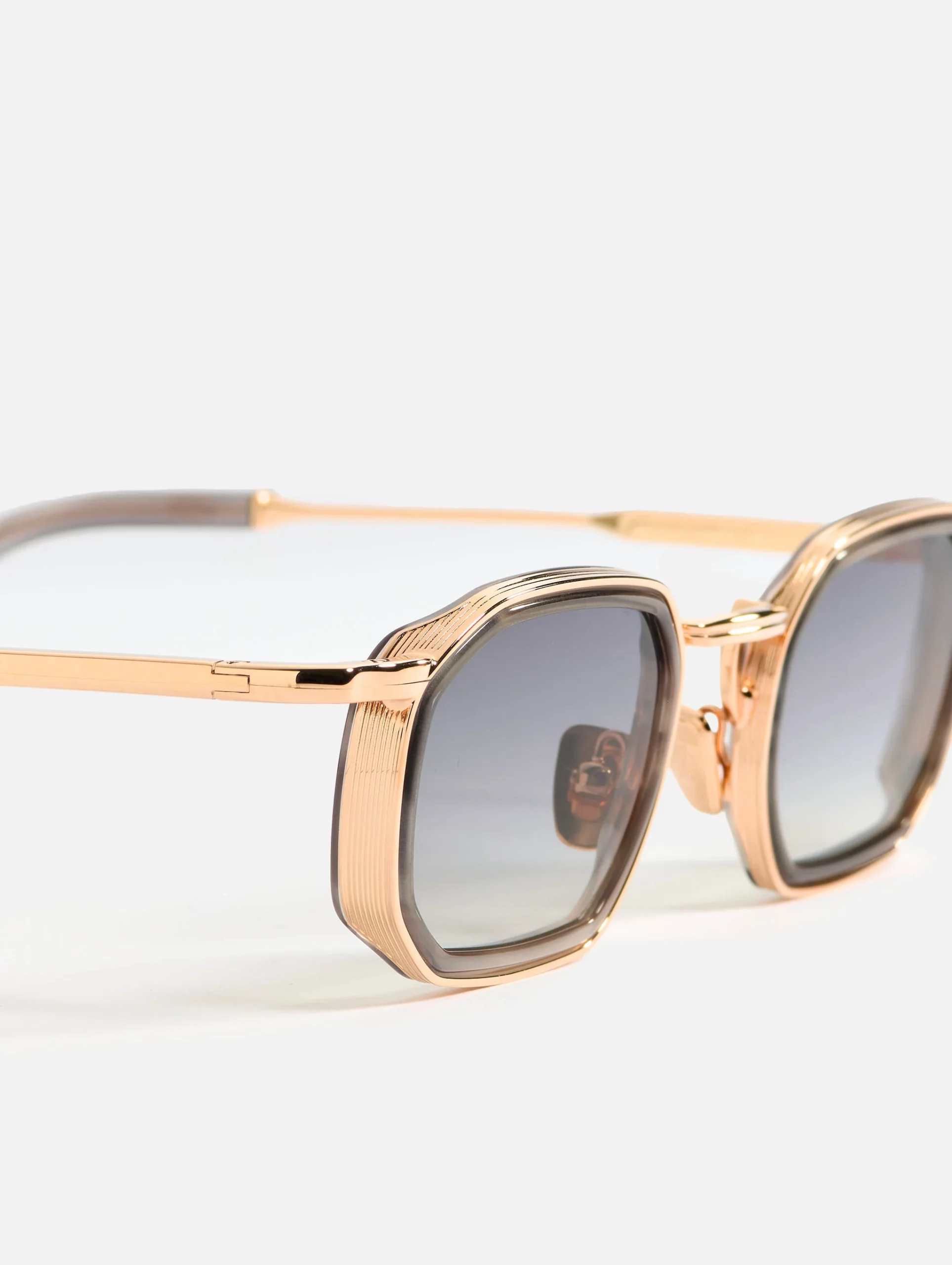 Samuel C154 features a distinctive graphic shape, with rims meticulously carved from a 4mm engraved metal strip. The frame is brought to life by our innovative geometric bridge and traditional end pieces, adding a touch of modern flair to its classic silhouette. Made from Workman Grey acetate and 22-carat rose gold plated alloy, adorned with a 5µ layer and a jewelry stamp inside the temple, Samuel C154 exudes opulence and exclusivity.