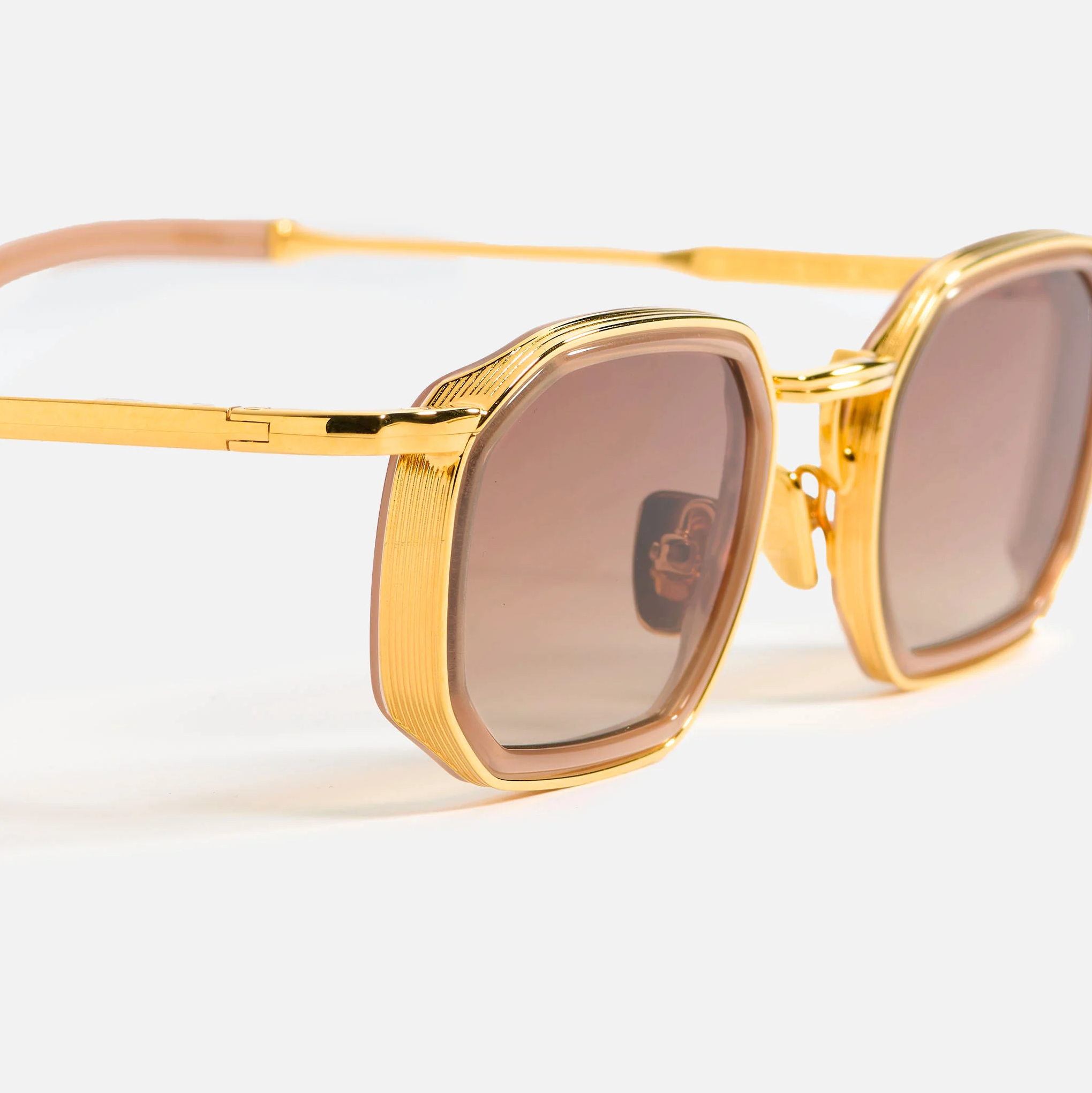 Enhance your style with Samuel C194, featuring a unisex graphic shape with rims carved from a 4mm engraved metal strip. These frames combine an almond acetate and 22-carat yellow gold plated alloy, exuding luxury. The vintage yellow gradient CR39 lenses with AR treatment ensure superior clarity. Complete with a case and cleaning cloth, Samuel C194 is the epitome of refined craftsmanship.